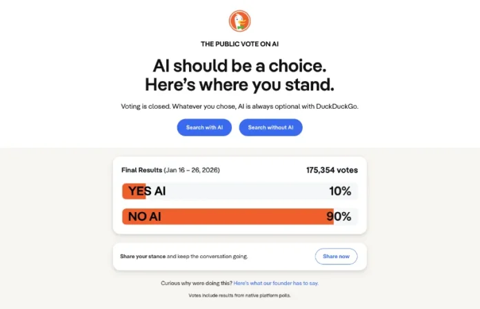 До крајот на минатиот месец, познатата алтернатива на Google Search, DuckDuckGo, поставија анкета во која ги прашуваа корисниците дали сакаат да пребаруваат со вештачка интелигенција или без.