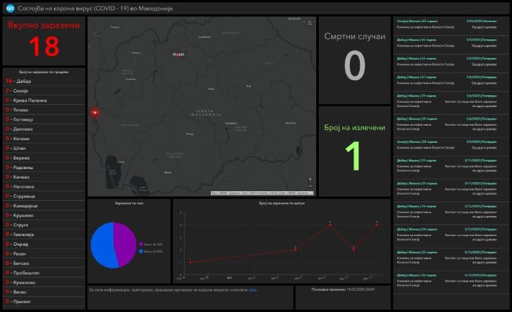 Втората страна е мапа со состојбата со вирусот во нашата земја, направена од компанијата ГДи. Оваа мапа е направена на Arcgis платформата и ги прикажува потврдените случаеви по градови, за разлика од светските мапи кои обично ја прикажуваат само земјата.