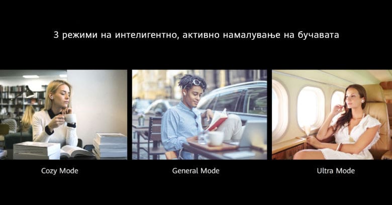 HUAWEI FreeBuds Pro се првите TWS (True Wireless Stereo) слушалки со интелигентно динамично намалување на бучавата. Со надградба на претходните модели, намалувањето на бучавата достигнува 40dB[1], а самиот in-ear дизајн помага да се елиминираат пречките во звукот. Парот микрофони, лоцирани внатре и надвор од увото, брзо ја идентификуваат звучната средина, а како резултат на тоа слушалките автоматски се префрлаат на некој од 3те режими за намалување на бучавата – Ultra Mode, Cozy Mode и General Mode. Во зависност од тоа дали сте дома, на прошетка или во бучна средина, HUAWEI FreeBuds Pro интелигентно ја проценува околината и преминува во соодветен режим за намалување на бучавата. Кога е вклучено активното намалување на бучавата, батеријата трае до 4,5 часа, а кога е исклучено – дури до 7 часа без да ја користите кутијата за носење и полнење. Активното намалување на бучавата може лесно да се вклучи или исклучи со потчукнување на слушалката.
