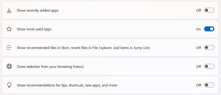 Втора поголема новина кај Старт менито е можноста да се исклучат предлозите за апликации и датотеки, па целиот тој дел да биде тргнат и да останат само прикачените апликации сите апликации.