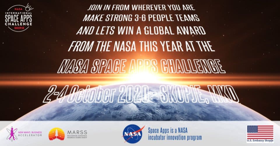Светскиот хакатон NASA Space Apps Challenge оваа година кај нас ќе се одржи по 8-ми пат во организација на Њуменс Бизнис Акцелератор од 2ри до 4ти октомври 2020, но за прв пат ќе биде во форма на комплетно виртуелен настан заради безбедност на сите учесници. Реализацијата ќе биде поддржана од глобална виртуелна форма преку која можат да се формираат тимовите, заеднички да се работи на решенијата, а учесниците ќе можат и директно да разговараат со експертите од NASA кои ги креираа овогодинешните предизвици.