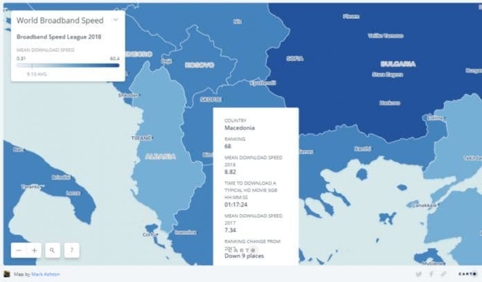Македонија се наоѓа на 68-то место со просечна брзина од 8,82 Mbps и потребно време за симнување на HD филм од 5 GB од околу час и 17 минути. Просечната брзина е зголемена за 1,48 Mbps, а нашата земја исто така има пад на листата од 9 места.