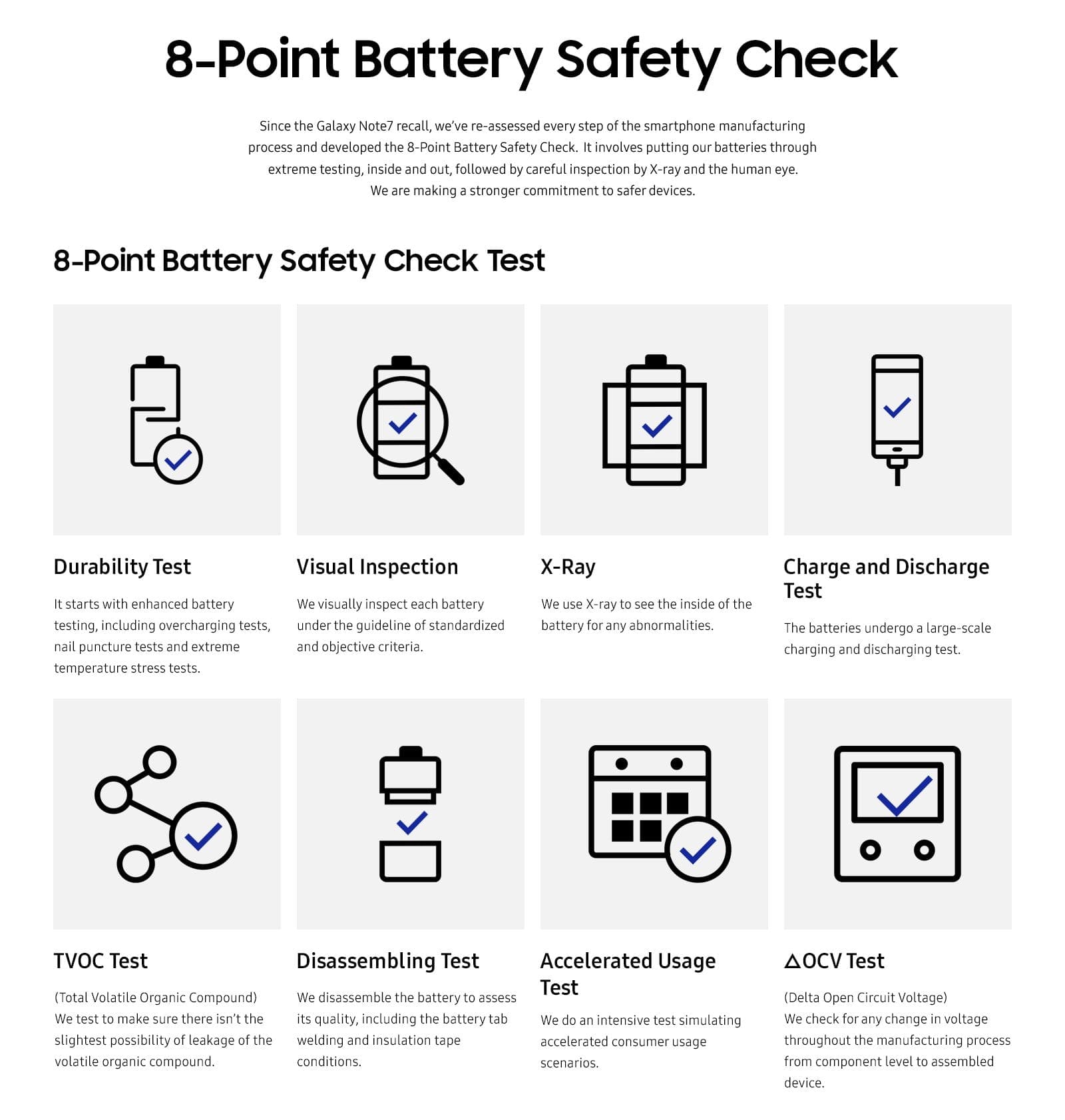 Врз основа на наодите кои компанијата ги доби од истражувањата, Самсунг имплементира широк спектар на интерни процеси за обезбедување на квалитет и безбедност, вклучувајќи дополнителни протоколи како повеќестепени мерки за безбедност и проверка на батериите во 8 чекори. Исто така, Самсунг формираше и Советодавна Група за Батерии составена од надворешни Советници, Академски и истражувачки Експерти, со цел да осигура јасна и објективна перспектива за безбедност на батериите и иновација. Членови на Советодавната Група за Батерии се: проф. д-р. Клер Греј (Clare Grey), Професор по Хемија, Кембриџ Универзитет; проф. д-р. Гербранд Сидер (Gerbrand Ceder), Професор по Наука за Материјали и Инженерство, Универзитет Беркли; проф. д-р. Ји Чу (Yi Cui), Професор по Наука за Материјали и Инженерство, Универзитет Стенфорд; проф. д-р. Тору Амазуцуми (Toru Amazutsumi), Извршен Директор, Амаз Техно (Amaz Techno).