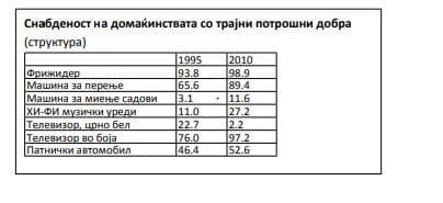 Според податоците од ДЗС, во споредба со почетокот на 90-тите денеска домаќинствата се подобро снабдени со трајни потрошни добра за ~20-30% за секој производ (!), имаат пристап до интернет во секое село по релативно ниска цена, скоро секој граѓанин (82%) има паметен телефон ем трошоците за комуникација се намалени за над 20% во споредба со 2005 (пред делумната либерализација), итн.
