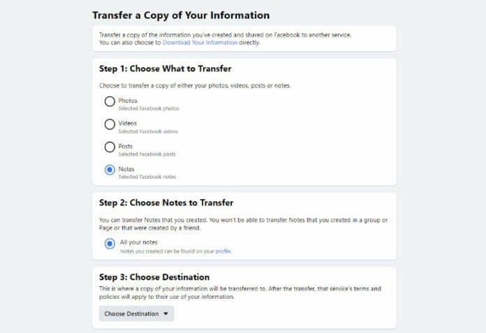 Префрлувањето на податоците се прави автоматски, исто како сликите и видеата, а се наоѓа во истиот дел, односно во Settings & Privacy > Settings > Your Facebook Information > Transfer a Copy of Your Information.