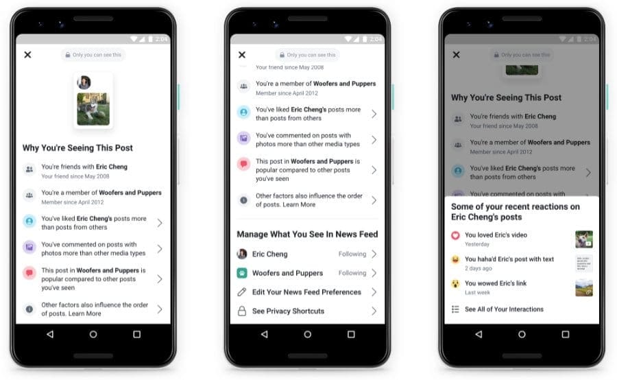 Заедно со овие информации, Facebook веднаш ќе ја дава можноста корисниците да ги променат параметрите на објавите кои ги гледаат, односно ќе можат да ги гледаат прво тие објави секогаш, да престанат да ги следат тие што ја имаат објавено таа објава и други додатни прилагодувања.