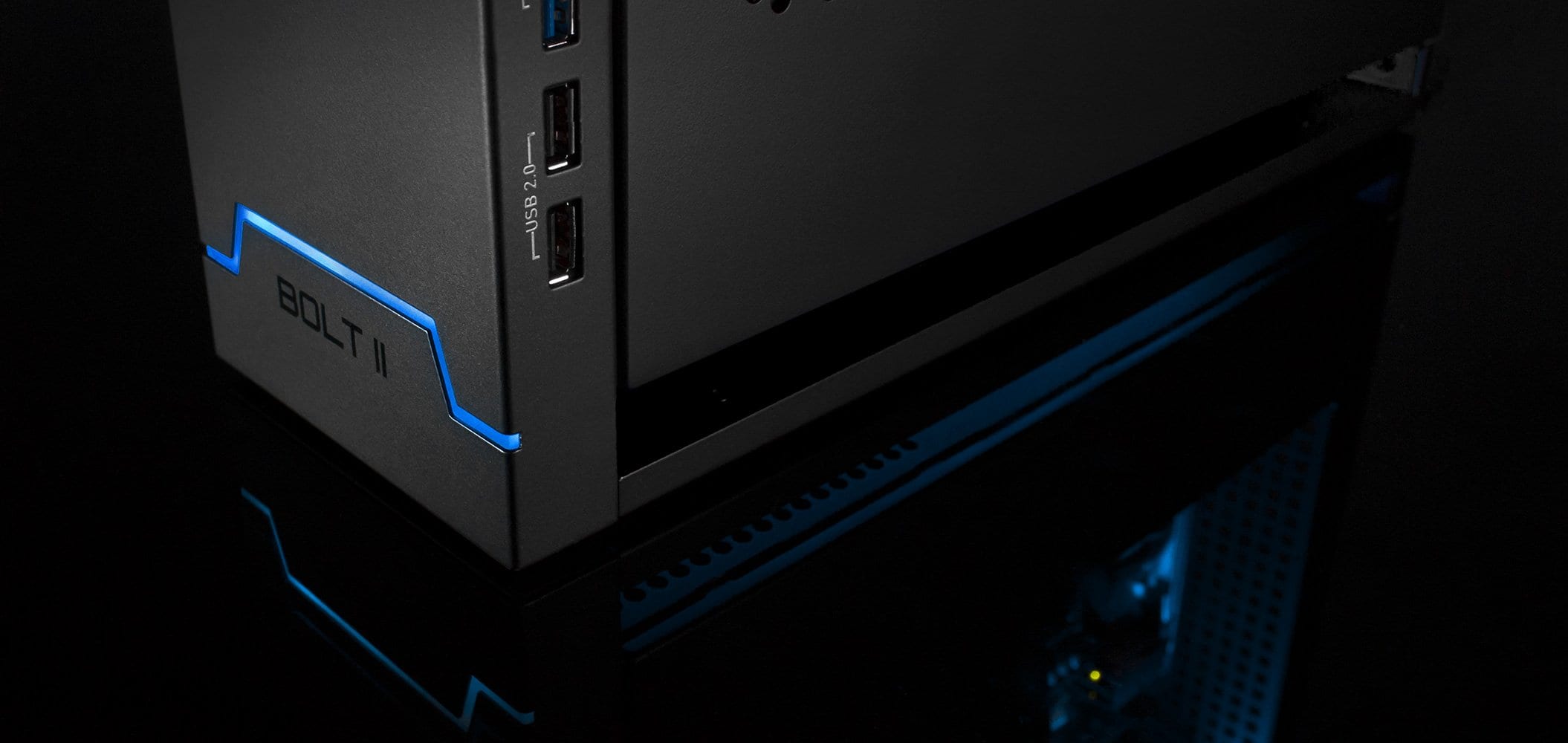 Bolt II доаѓа во црно компактно куќиште со димензии од 16.4 x 4.4 x 14.1 инчи, кое може да биде поставено во хоризонтална и вертикална положба. Основните спецификации вклучуваат Intel Core i5 процесор од последната генерација кој ќе работи на фреквенција од 4.2 GHz, SSD со капацитет од 120 GB и хард диск од 1 TB. Процесорот кој функционира вон стандардните Intel спецификации ќе биде ладен од систем на вода со 240 милиметарски радијатор. Остатокот од компонентите ќе зависат од желбата и финансиските можности на корисниците.