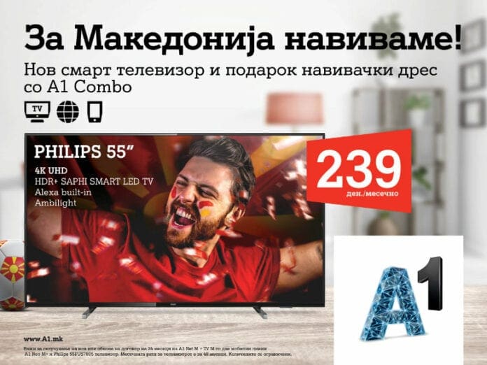 Од денеска, во портфолиото на А1 Македонија, како дел од понудата во А1 Combo М и L, достапна е најновата промоција со која постоечките и нови корисници покрај супербрз и стабилен интернет, ТВ со најквалитена слика на пазарот, Арена Спорт ТВ канали добиваат и зголемен попуст за атрактивниот Philips 55 инчен телевизор или било кој друг уред по нивен избор. Со активирање на A1 Combo M пакетот со две мобилни линиии или A1 Neo M+ корисниците добиваат 18.000 денари попуст за било кој уред. Дополнително, сите нови корисници на А1 Combo М или L пакетите добиваат и подарок – специјално дизајниран навивачки дрес со кој заедно ќе навиваме за тимот на македонската фудбалска репрезентација.