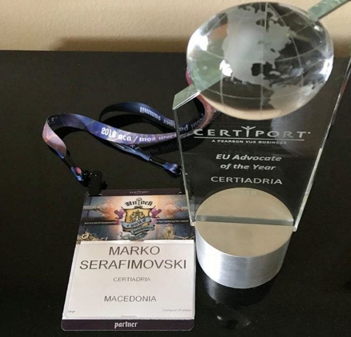 Тимот на Цертиадриа кој има за цел да ја промовира потребата од дигиталните вештини постигна голем меѓународен успех. Нејзините вредности и напорен труд беа препознаени од американскиот партнер Сертипорт кој на традиционалниот Глобален Партнерски Самит што минатата недела се оддржа во Орландо, менаџментот на Сертипорт ја награди Цертиадриа со наградата “EU Advocate of the Year“. Наградата се доделува секоја година на партнер, кој на својот континент остварил придонес за зголемување на свеста за потребата од дигитална писменост и сертификацијата.
