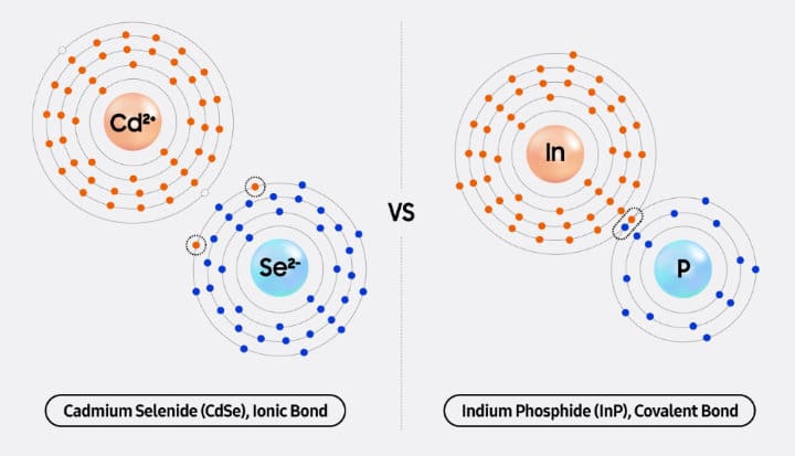 Напротив, индиумот (In) — алтернатива на кадмиумот со три валентни електрони — формира ковалентни врски со елементи како фосфор (P), кој има пет валентни електрони. Ковалентните врски генерално се помалку стабилни од јонските врски и имаат насочена природа, што го зголемува ризикот од дефекти при синтезата на нанокристали. Овие карактеристики го направија индиумот предизвик за работа во истражувањето и масовната продукција.