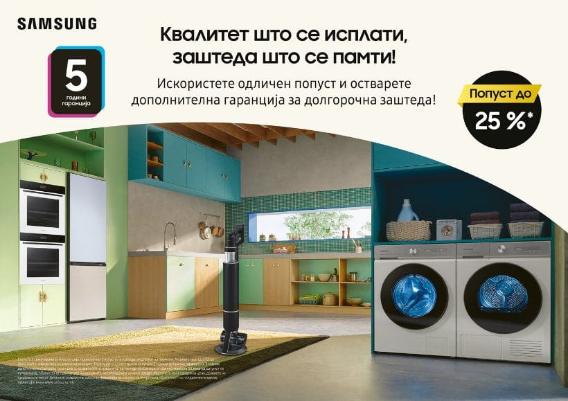 Со комбинација од избрани апарати за домаќинство од Samsung, вашиот дом наесен ќе блесне. Затоа искористете ја оваа неверојатна можност, бидејќи со купување на избрани модели на правосмукалки, машини за перење и сушење, машини за миење садови, печки и фрижидери, вие добивате до 25% попуст и петгодишна гаранција за долгорочна безбедност. Петгодишната гаранција вклучува 2 години фабричка гаранција и 3 години дополнителна Samsung гаранција под услов да се регистрирате на samsungprodolzenagarancija.mk најдоцна 30 дена од денот на купувањето. Промоцијата трае од 2.10.2023 до 28.10.2023 година, или додека има залихи, а за повеќе информации посетете го линкот.