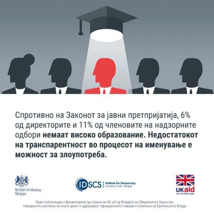 Но, истражувањата на Институтот за демократија „Социетас Цивилис“- Скопје покажуваат дека јавните претпријатија се управувани од луѓе со недоволно искуство во областа на работата на претпријатието и со несоодветно формално образование. Иако високото образование е јасен формален критериум за избор на директори и членови на надзорните одбори на јавните претпријатија, во реалноста ситуацијата е поинаква.