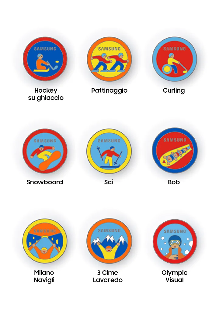 Духот на споделување значки ја одразува улогата на „Samsung“ во поврзувањето на луѓето преку олимпиското движење. На Милано Кортина 2026, „Samsung“ ја продолжува својата долгогодишна традиција на создавање олимписки значки со нова колекција развиена во соработка со реномираната илустраторка Олимпија Зањоли (Olimpia Zagnoli).