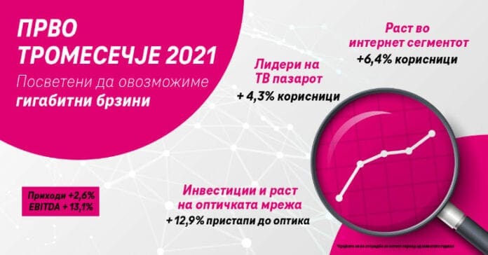 Во првите три месеци од 2021 година Македонски Телеком оствари раст и позитивни резултати, особено во сегментите за интернет и телевизија. Приходите од продажбата се зголемени за 2,6 отсто и изнесуваат 2.686 милиони денари. Оперативната добивка пред камати, оданочување и амортизација (EBITDA) е зголемена за 13,1 отсто, во споредба со истиот период претходната година.