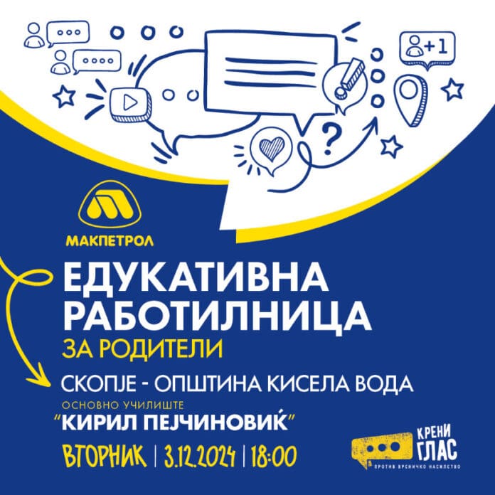 Родителите од Општина Кисела Вода утре (3 декември) со почеток од 18 часот ќе имаат можност да разговараат и подетално да се запознаат со проблемот со врсничкото насилство. Работилницата организирана од „Макпетрол“ ќе се одржи во основното училиште „Кирил Пејчиновиќ“. Ова е шеста едукативна средба наменета за родители во рамки на општествено одговорната кампања „Крени глас – Стоп за булинг“. Водител на настанот ќе биде популарниот актер Сашко Коцев.