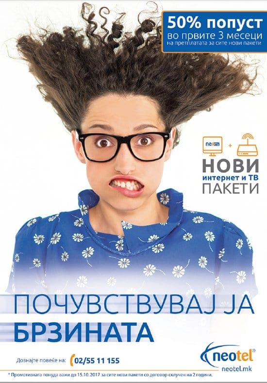 Кога сакаш супериорни брзини и симетричен upload тогаш знаеш што ти треба. Оптичкиот интернет за разлика од останатите технологии нуди огромни брзини, како и симетричност, односно upload со иста брзина како и download-от. А токму тоа може да се добие со телекомуникацискиот оператор Неотел, оптички пакети со брзини до 100 Mbps и тоа сега со попуст од 50 отсто на претплатата за првите три месеци. Сите оние кои сакаат да ја искористат оваа поволност треба да побрзаат бидејќи понудата важи до 15 октомври 2017 година.
