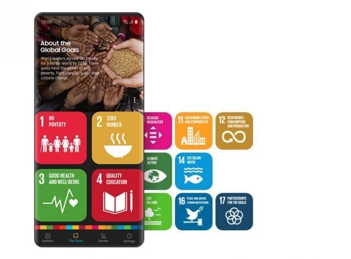 ‘Samsung Global Goals’ апликацијата, достапна на Samsung Galaxy смартфоните, цели кон зголемување на свеста и собирање на средства за УНДП да ја оддржи својата работа низ целиот свет. Додатно, Samsung ќе извади специјално издание на додатоци, од кои ќе се донира дел од приходот од продажбата на секој додаток директно во УНДП за поддршка на Глобалните цели. Маската за Galaxy Note10 со дизајнирана тема на Глобалните цели и безжичниот полнач ќе бидат претставени на самото претставување на уредот.