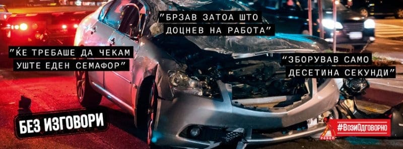 Некои од возачите знаат да кажат: „Моја одлука е да не користам појас додека возам во автомобил“ или „Моја е одлуката да не застанам на пешачки премин“. Ова се само дел од бизарните изговори. Но, дали твоја одлука е да учествуваш во сообраќајна незгода што може да заврши со тешки телесни повреди или смрт? Безбедното и одговорното учество во сообраќајот, не се право на избор, туку обврска и не познаваат изгвори и извинувања.