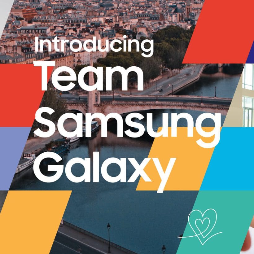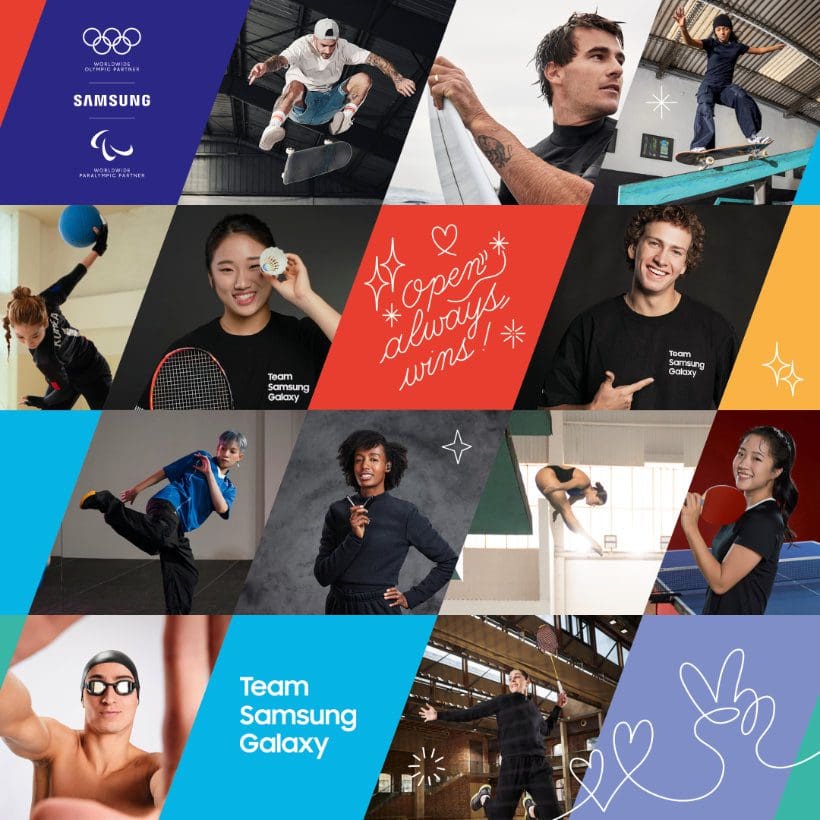 За Олимпиијадата во Париз, тимот на Samsung Galaxy е составен од над 25 олимпијци и параолимпијци, вклучувајќи ги британскиот скејтбордер Скај Браун (Sky Brown), шпанската шампионка во бадминтон Каролина Марин (Carolina Marin), францускиот херој во скејтбординг Орелиен Жиро (Aurélien Giraud), американската „б-девојка“ Грејс „Сани“ Чои (Grace “Sunny” Choi), германскиот пара спринтер Јоханес Флорс (Johannes Floors), јужнокорејската фудбалска икона Сон Хеунг-мин (Son Heung-min) и многу други. Во тимот има неколку спортисти од некои од најновите спортови на игрите: скејтбординг, сурфање и брејкденс, кои, како и Samsung, ги споделуваат основните вредности на отворен ум и самоизразување.