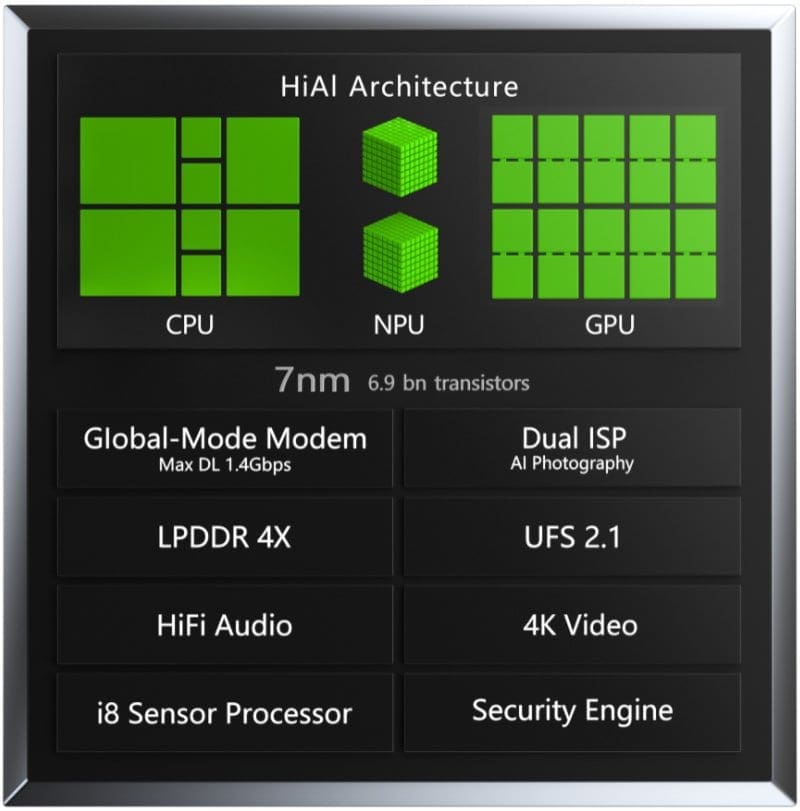 Најсовремената TSMC 7nm процесна технологија му овозможува на Кирин 980 да спакува 6,9 милијарди транзистори во големина од 1 см2, што е за 1,6 пати повеќе од претходната генерација. Споредено со 10nm процесорот, 7nm процесот обезбедува 20 отсто подобрени перформанси SoC и 40 отсто подобрена SoC ефикасност. Kirin 980 е исто така првиот SoC, (system on chip) систем, опремен со јадра Cortex-A76, кои се со 75% поголема моќност и со 58% поголема ефикасност во споредба со оние од претходната генерација. Во осмата нуклеарна конфигурација на Kirin 980 има две високо ефикасни Cortex-A76 јадра и четири екстремно ефикасни Cortex-A55 јадра. За да го извлече максимумот од оваа конфигурација, Huawei разви иновативен Kirin CPU потсистем со Flex-Scheduling технологија која флексибилно ги дистрибуира соодветните процеси кон најсоодветните нивни јадра. Ова решение ги насочува интензивните оптоварувања кон поголемите производителни јадра, за да се обезбеди постојана продуктивност, а ултра најефикасните јадра се грижат за секојдневните, полесни активности, потпирајќи се на екстремната енергетска ефикасност.