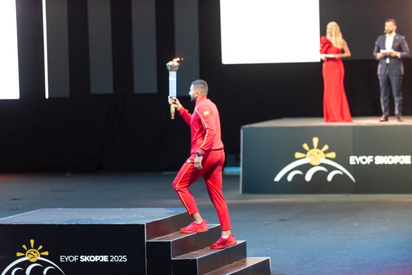 Еден од најемотивните моменти на вечерта беше пристигнувањето на македонскиот олимписки теквондист Дејан Ѓоргиевски, кој како прв носител на Пламенот на мирот и солидарноста ги поздрави присутните во арената, најавувајќи го симболичното патување на факелот. Потоа се приклучија и македонските спортски херои Мила Релиќ, Бобан Илиоски, Дивна Пешиќ, Берат Јакупи и Пулексенија Јованоска, а факелот официјално го запали нашиот најдоба атлетичар Дарио Ивановски. Со овој чин беа симболично обединети трите градови домаќини – Скопје, Куманово и Осиек – и беше промовирана идејата на ЕМОФ Скопје 2025 како настан што го обединува континентот преку спорт, култура и солидарност.