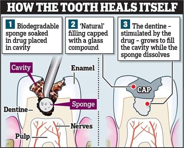 Тие користеле биоразградливи сунѓери натопени со мали дози од лекот, кои ги нанесувале на оштетените катници на глувчиња. По шест недели, сунѓерите целосно се распаднале, а забите успеале да развијат нов дентин на оштетеното место.