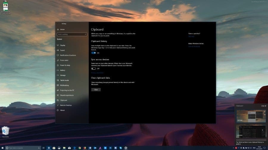 Кога ќе ископирате нешто, најчесто со Ctrl + C, последното останува во меморијата и можете да го пренесете повеќе пати.  Новиот систем ги зачувува сите копирани работи, па преку притискање на Windows Key + V можете да ја видите листата со се што имате копирано. Со ова се трга потребата да повторно треба да ја отворате апликација, документот или што и да е, за да повторно ископирате.