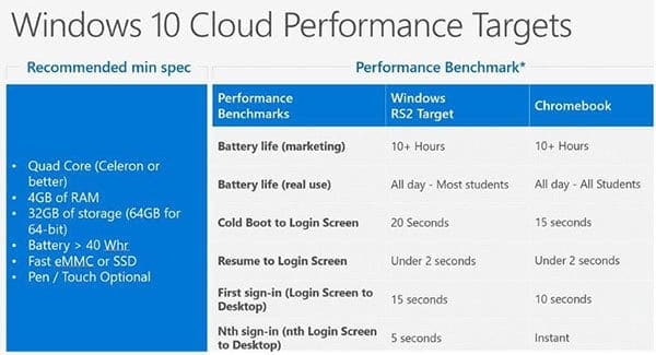 Windows 10 Cloud ќе биде делумно полесен оперативен систем од стандардната 10-ка. Затоа, Microsoft цели на перформанси како на Chrome OS, односно траење на батеријата преку 10 часа, брзо стартување на оперативниот систем (околу 20 секунди) итн. Подолу на сликата може да се види што Microsoft очекува од овој систем во секој параметар, а споредено со Chrome OS.