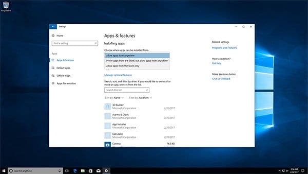 Во обид да ги заштити корисниците од малициозен софтвер, но и да донесе повеќе дивелопери и следствено на тоа апликации во Windows Store, Microsoft ќе вгради нова функција во Windows 10, која ќе му овозможи на корисникот да блокира инсталирање на Win32 програми кои не се од пазарот за апликации.