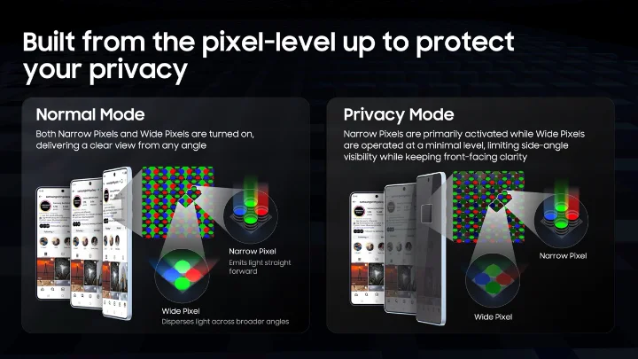 Интегриран директно во хардверот на екранот, Privacy Display на Galaxy S26 Ultra контролира како пикселите на екранот ја распрснуваат светлината. Кога е вклучен, ја ограничува видливоста од странични агли, а кога е исклучен го задржува целосното искуство на приказ од било кој правец. Овој пристап базиран на хардвер обезбедува појасно и поконзистентно искуство во споредба со традиционалната заштита за приватност на екранот, која трајно ја намалува осветленоста и јасноста и може негативно да влијае на одговорот на допир на самиот екран.