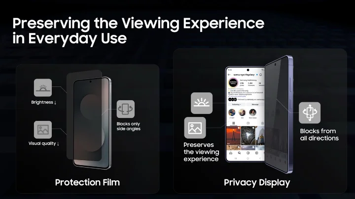 За разлика од дополнителните заштитни фолии за приватност што се лепат на екранот, Privacy Display на Galaxy S26 Ultra обезбедува заштита без компромис во искуството при гледање за време на секојдневната употреба.