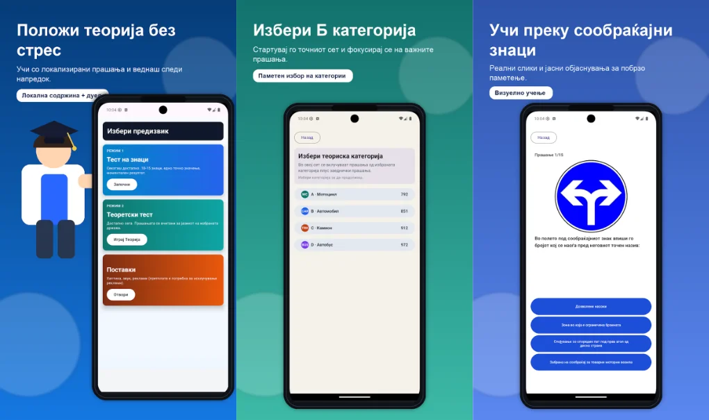 Мобилните апликации можат да го олеснат тој процес, барем за теоретскиот дел. Проблемот е што повеќето апликации за возачки испит на Google Play се правени за американскиот пазар — со прашања за DMV тестови и знаци кои кај нас едноставно не важат.