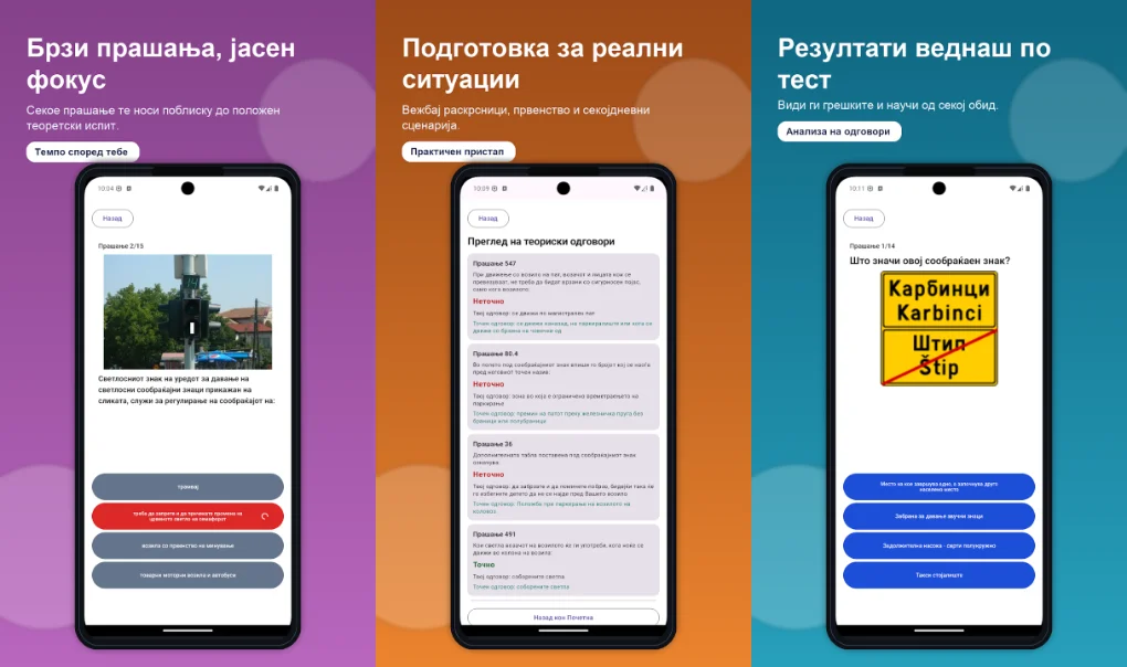 Автошкола – Возачки испит е апликација која се обидува да го реши токму тој проблем. Развиена е од скопскиот програмер Дарко Петковски, а нуди квизови со сообраќајни знаци и теоретски прашања.