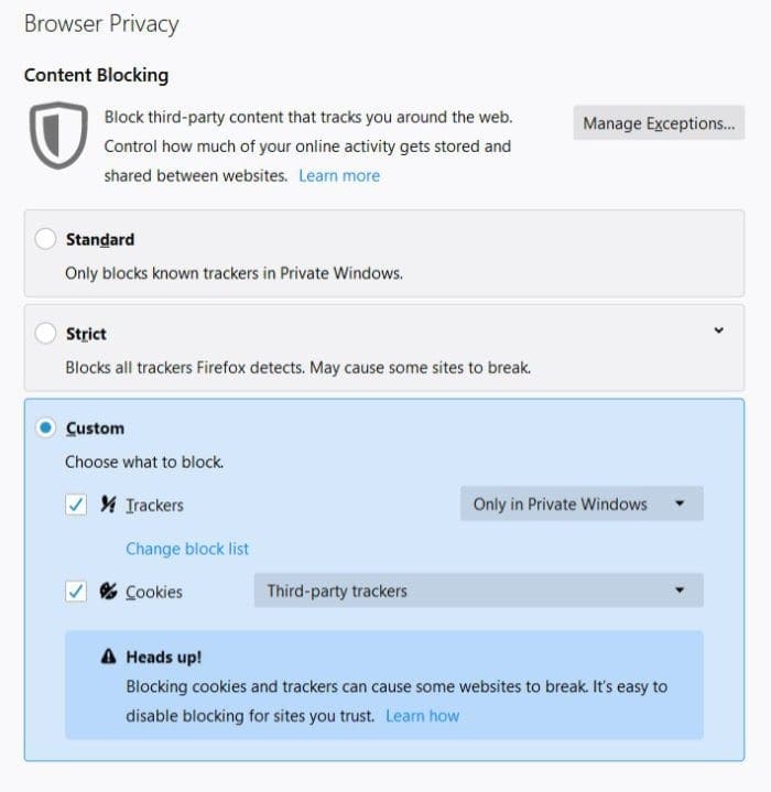 Од Mozilla истакнуваат дека доколку се избере да се блокираат сите тракери и колачиња, некои бев страни може да не функционираат како што треба.