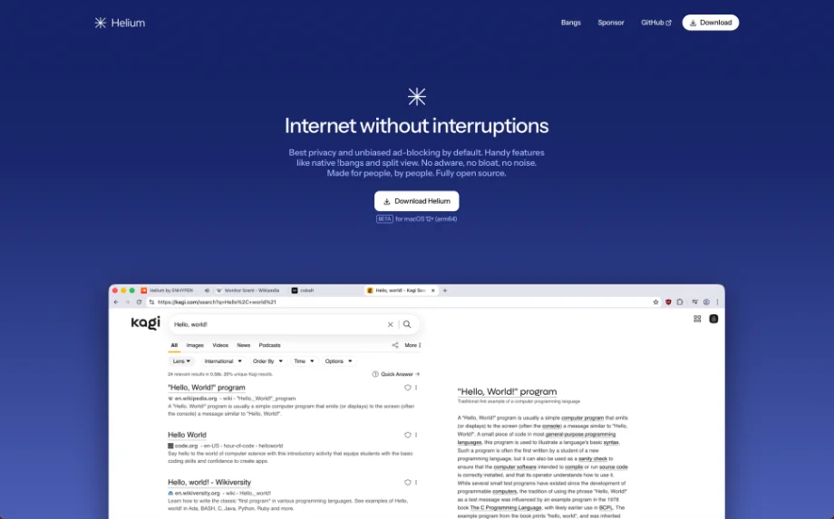 Helium е уште еден прелистувач кој својата главна „продажна“ точка ја темели на тврдењата за приватност и брзина на работа.