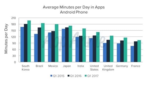Најинтересно од сѐ, вкупното време кое корисниците го трошат на апликации на својот смартфон е пораснато на 2 часа и 15 минути и ова е највисока бројка во историјата, која константно расте од 2015 година. Во ова време, корисниците на Android играат повеќе игри, додека оние на iOS повеќе „дремат“ на социјалните мрежи, но како и да е, тоа е исклучително голема бројка.