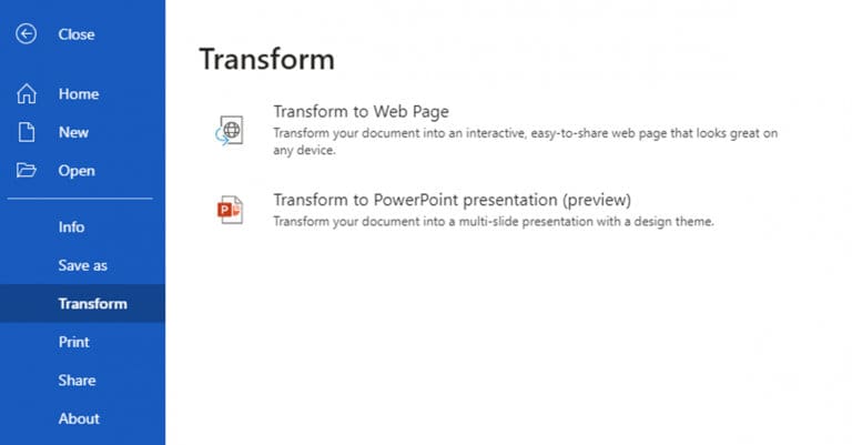 Новата „transform“ функција ќе биде достапна преку File > Transform > Transform to PowerPoint presentation. Документот ќе биде зачуван во главната папка во OneDrive на корисникот.