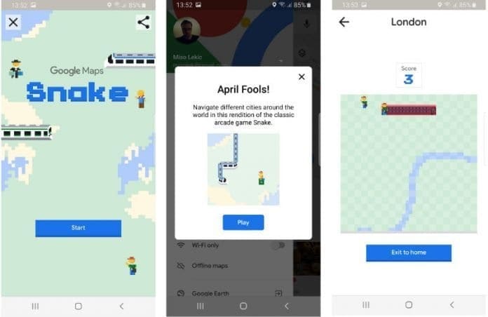 Google како и секогаш има по нешто кога се во прашање познатите дати. Денеска е 1-ви април, па во „чест“ на овој празник на шегата, Google овозможи играње на старата и позната игра „Змија“ (Snake) во Google Maps апликацијата.