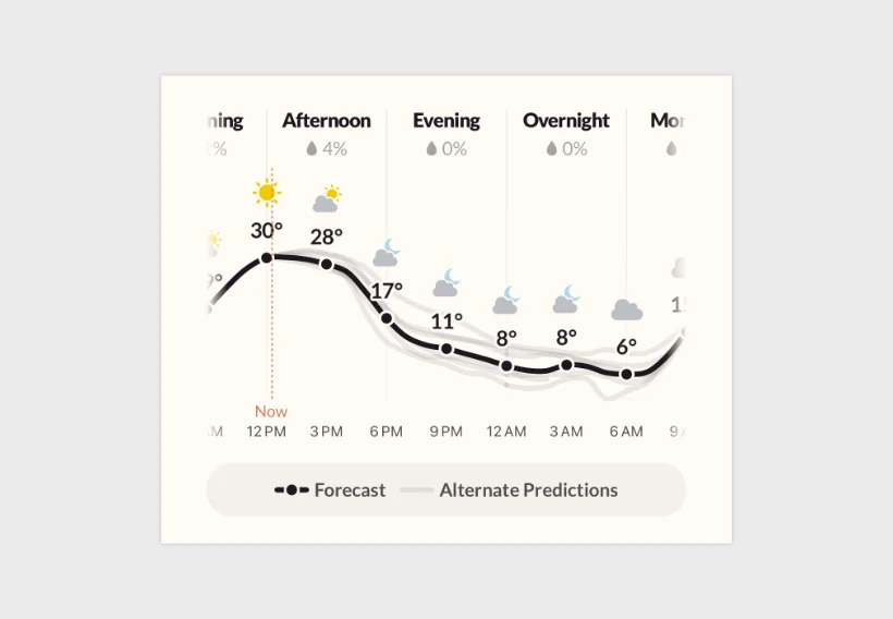 Главната разлика помеѓу Acme Weather и стандардните апликации за временска прогноза е начинот на кој се прикажува сигурноста на метеоролошките податоци. Наместо да нуди само едно предвидување кое може да се покаже како погрешно, апликацијата користи графички прикази за да ги визуализира алтернативните сценарија.