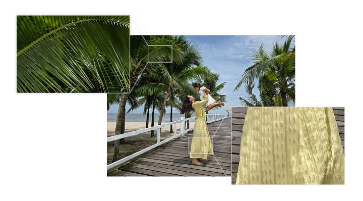 Во срцето на камера системот на Galaxy Z Fold7 се наоѓа широката 200 MP камера – истата како кај Galaxy S25 Ultra – и највисока резолуција досега кај Z Fold серијата. Со неа можете да ја фатите секоја нијанса од сцената – од богатите текстури и бои на облеката во вашите фотографии од одмор, па сè до деликатните контури на огромниот пејзаж зад вас. Ова се некои од главните придобивки од широкоаголната камера на Galaxy Z Fold7: