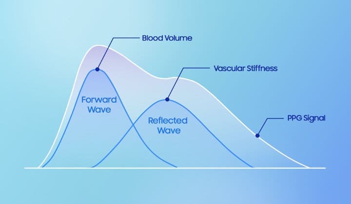 - Васкуларен товар: Додека спиете, Galaxy Watch8 ги чита фотоплетизмографските (PPG) бранови – оптички сигнали поврзани со протокот на крв. Тој мери волумен на крв и васкуларна вкочанетост, прецизно анализирајќи ги промените во оптовареноста на крвните садови. Со оглед дека исхраната, стресот и одморот влијаат на оваа метрика, редовното следење покажува кои навики треба да се подобрат за да се намали кардиоваскуларниот ризик пред да стане проблем.