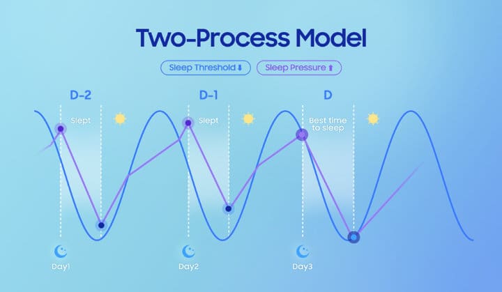 - Водство за оптимално време за спиење: Потпирајќи се на науката зад моделот на двоен процес за регулирање на спиењето, Galaxy Watch8 го следи вашиот циркадиски ритам (внатрешниот биолошки часовник) и притисокот за спиење (колку ви е потребен сон), во текот на три дена. Потоа, врз основа на диференцијална равенка, пресметува кое е оптималното време за легнување со цел да се разбудите одморени. Алгоритмот ги зема предвид промените во прагот за спиење и индивидуалните потреби, давајќи персонализирани препораки. Развиена од KAIST и клинички тестирана во Samsung Medical Center, оваа функција ви помага да создадете поздрави рутини за спиење, што води до подлабок и помалку прекинат сон и поенергични утра.