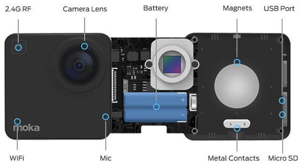 Во камерата е инаку вграден сензор од Sony со 16 мегапиксели, кој може да снима во максимална резолуција од 3840х2160 пиксели со 25 слики во секунда, поточно 4K Ultra HD. Леќата има прилично широк агол од 152 степени и софтвер кој може да ја исправи дисторзијата која ја прави толку широката леќа. Mokacam велат дека вградениот микрофон е прилично квалитетен и може да сними звук во висока дефиниција.