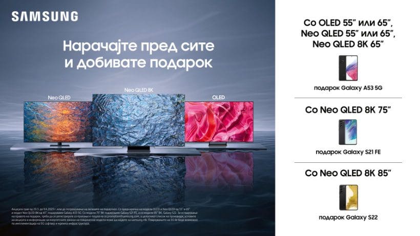 Скопје, 20.3.2023 – Компанијата Samsung Electronics неодамна ги претстави новите производни линии Neo QLED и Samsung OLED кои нудат премиум искуства и ги прошируваат опциите за гледање. Новите уреди се веќе достапни за преднарачка во Македонија, а додека трае специјалната понуда, купувачите добиваат одлични подароци – атрактивните Samsung паметни телефони. Со претходна нарачка на OLED и Neo QLED моделите 55” и 65” и Neo QLED 8K моделот 65”, добивате подарок Galaxy A53 5G смартфон. Заедно со моделите Neo QLED 8K 75”, на подарок добивате и Galaxy S21 FE, а со моделот NEO QLED 8K 85”, на подарок го добивате Galaxy S22.