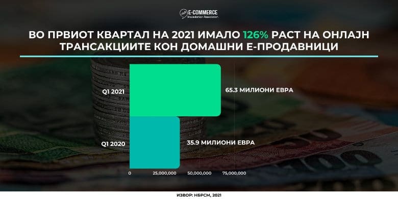 Согласно податоците за бројот на реализирани трансакции во текот на првите три месеци од 2021 година, објавени на веб страната на НБРСМ, бројот и вредноста на реализирани онлајн нарачки и купувања во текот на анализираниот период покажува дека растот на е-трговијата продолжува и оваа година. Во првиот квартал од 2021 година вредноста на онлајн трансакциите реализирани во земјата и во странство, изнесува 86,6 милиони евра, што во споредба со истиот период 2020 година кога се реализирале 49,6 милиони евра претставува пораст за 74,6%. Бројот на направените транскации во истиот период спрема минатата година забележува пораст од 65%, што значи дека вредноста на просечната трансакција е зголемена. Имено, во текот на првите три месеци од 2021 година реализирани се вкупно 3.228.182 онлајн трансакции во земјата и во странство, наспроти 1.954.957 онлајн трансакции во текот на првите три месеци од 2020 година.