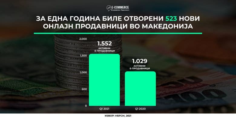 Споредбено со 31.03.2020 година кога бројот на активни е-продавници изнесувал 1.029, можеме да заклучиме дека за една година отворени се вкупно 523 нови е-продавници што претставува пораст од 51%.