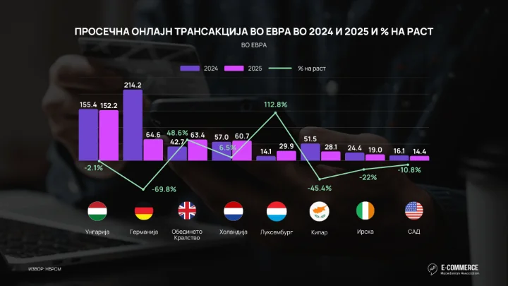 Највисока просечна вредност на е-трансакција Македонците оствариле во Унгарија од 152,2 евра, иако помалку од лани за 2,1%, додека во Луксембург направиле најниска просечна трансакција и истата изнесува 14,1 евра. Во 2025 година се забележува драсатичен пад на просечната трансакција во Германија од скоро 70% која минатата година беше највисока и изнесуваше 214,2 евра.