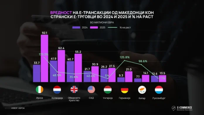 Македонците оствариле најголема вредност на е-трансакции во Ирска, во износ од 92,1 милиони евра, со пораст од 173% во однос на минатата година, додека во Холандија е остварена вредност од 62,4 милиони евра и пораст од 49% во однос на минатата година.