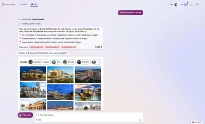 На пример, од насловната слика можете да видите дека му кажавме на Bing да ни прикаже слики од Скопје. Тој по краток текстуален одговор, во продолжение прикажа повеќе слики од градот со линк да се видат повеќе слики.