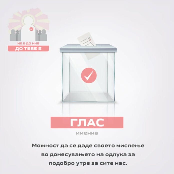 Со тоа што ќе го искористиш правото на глас, се грижиш за твоите блиски и сакани, се грижиш за иднината на татковината и им даваш одличен пример на новите генерации. Доколку на овие избори излезеш и гласаш, ќе ги мотивираш сите околу тебе да го искористат нивното право и да ја исполнат нивната основна обврска. Гласај, за да им покажеш и на останатите дека не е до нив, до нас е.